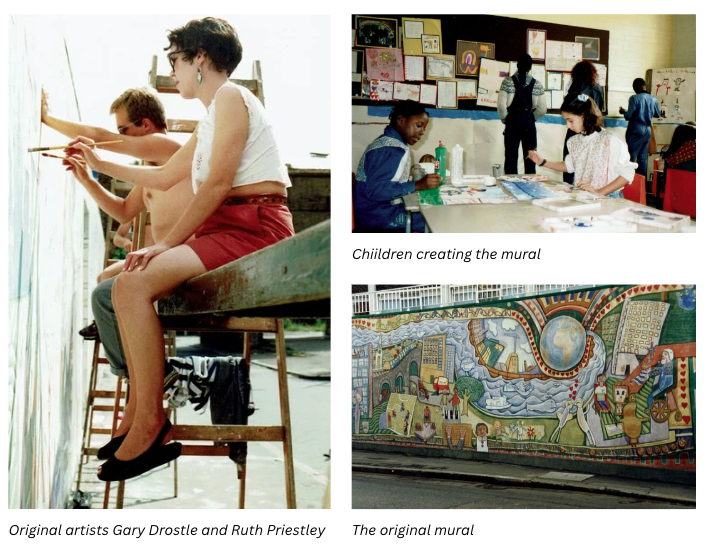 In 1989, a mural inspired by the graffiti was commissioned and created by artists Gary Drostle and Ruth Priestley, with design contributions from local primary school children. The result was an iconic piece of art, showcasing issues of wealth distribution, the environment, disability and equality of opportunity. Sadly, over time changes to the area and the deterioration of the wall meant the mural could no longer be maintained in its original location.